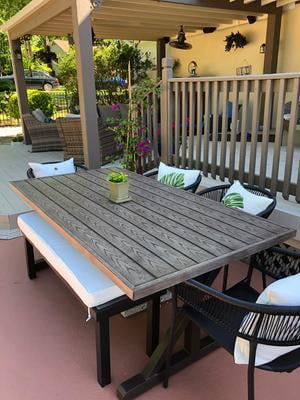 Maybe you would like to learn more about one of these? Rectangular metal outdoor dining table with farmhouse trestle base and tile tabletop. We did not find results for: Check spelling or type a new query.